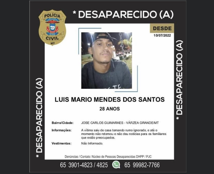 ATENÇÃO DESAPARECIDO !!!.LUIS MARIO MENDES DOS SANTOS.Se tiver qualquer informação ligue 197 ou contate-nos diretamente pelo 65 3901-4823 e 65 99982-7766 pjc #pjcmt #desaparecidos desaparecidosdhppmt #policiacivil...
