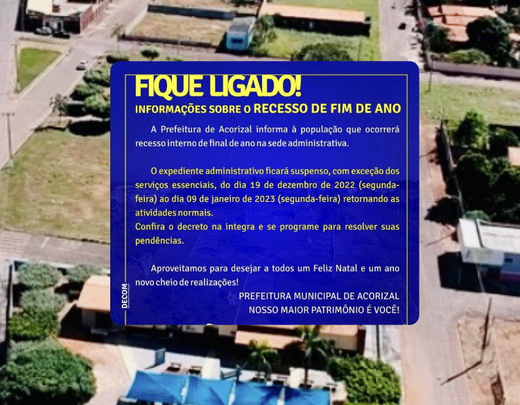 A Prefeitura de Acorizal decretou recesso administrativo a partir de hoje 19/Dez com retorno previsto para dia 09/Jan. Somente os serviços essenciais funcionarão. Vejam a nota...