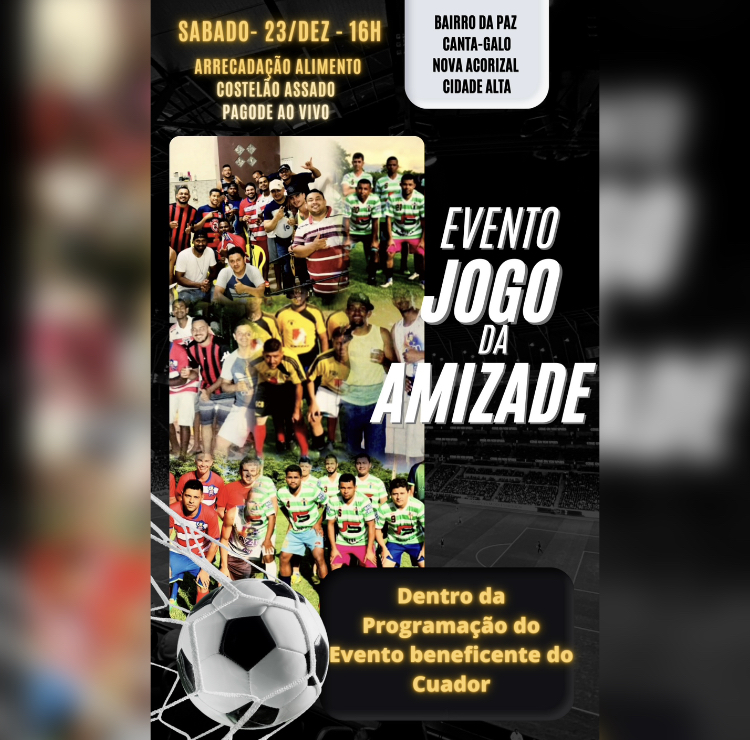 Os amigos dos bairros da Paz, Cidade Alta, CantaGalo, Nova Acorizal e Centro farão o Jogo da Amizade deste ano no próximo sábado dia 23/Dez às 16h no Zezinho Gusmão.
