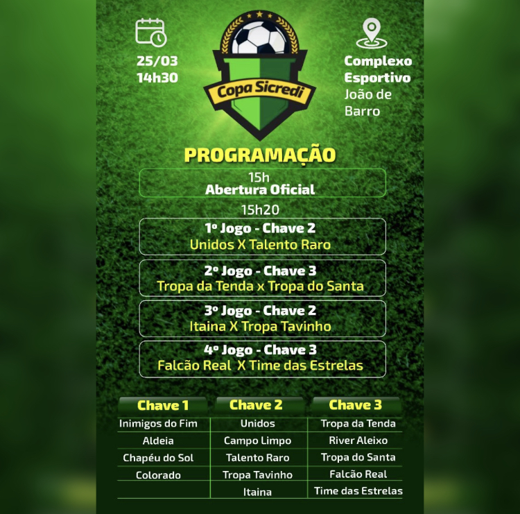 A 1ª Copa Sicredi de Acorizal terá início neste sábado (25) com às seguintes partidas: