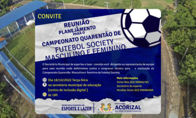 A Prefeitura Municipal por meio da Secretaria de Esporte anunciou a pouco nas redes sociais que será realizada no dia 18/10/22 uma Reunião de Planejamento para...