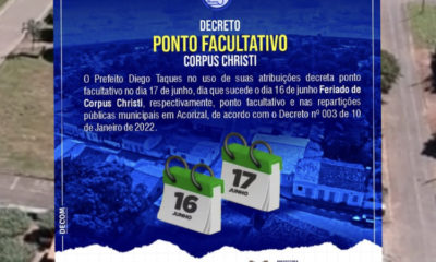A Prefeitura Municipal de Acorizal anunciou a pouco por meio de nota em suas páginas oficiais o Decreto que estabelece ponto facultativo nesta sexta-feira (17), assim...