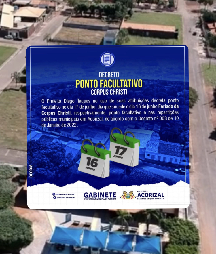 O Prefeito Diego Taques no uso de suas atribuições decreta ponto facultativo no dia 17 de junho, dia que sucede o dia 16 de junho Feriado de Corpus Christi, respectivamente, ponto facultativo e nas repartições públicas municipais em Acorizal, de acordo com o Decreto nº 003 de 10 de Janeiro de 2022.