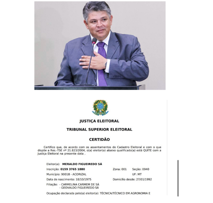 O Tribunal Superior Eleitoral (TSE) liberou na terça-feira a quitação eleitoral do ex-prefeito de Acorizal, Meraldo Sá (PSD). Com a decisão, ele está apto a concorrer na eleição deste ano em outubro, caso decida dessa forma.