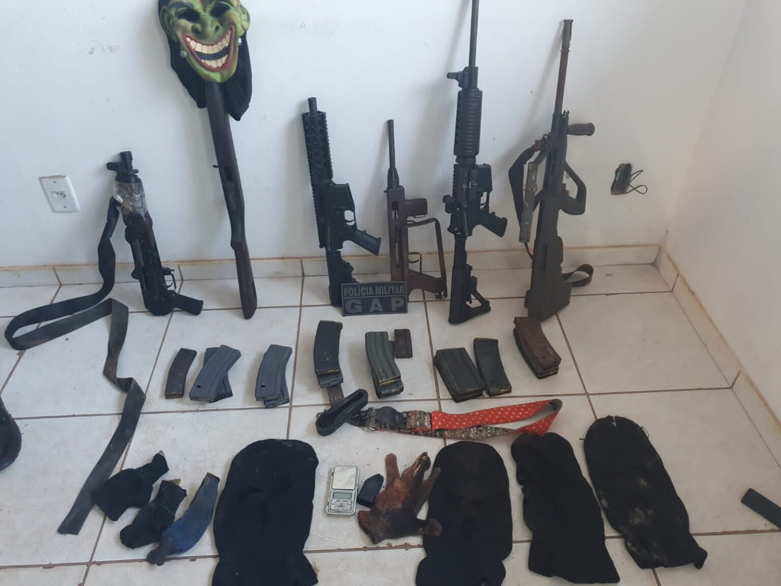 Policiais militares apreenderam na tarde desta terça-feira (28) um verdadeiro arsenal no Residencial Buriti, em Cuiabá. Ao menos seis fuzis, calibres 556, 9 mm e 7.62, foram apreendidos pelos militares.